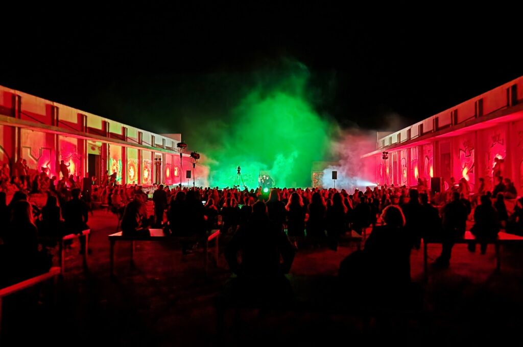 – Jel vidiš ti ovo? Svaka čast šta su se sitili tu napraviti predstavu, baš san cili oduševljen – govori Luka Škugor Scuba, frontmen šibenskog Hrama dok ulazimo u ograđeni prostor za predstavu na mjestu gdje se zadnjih godina održavaju DJ programi s elektroničkom muzikom.
